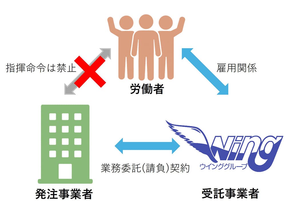ウイングと雇用契約を結んだスタッフが業務に従事し、就業上の指示命令、労務管理、スタッフへの給与の支払い、福利厚生の提供など、業務運営の全てをウイングが行います。