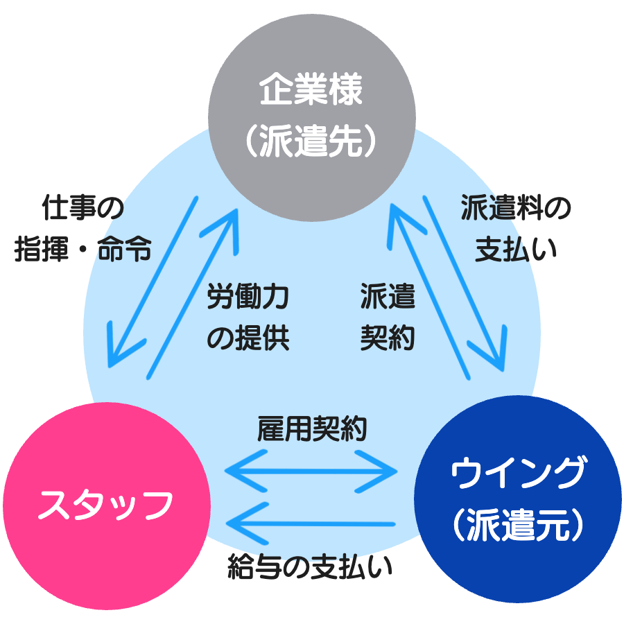 スタッフへの給与の支払い、社会保険手続き等の福利厚生の提供はウイングが行い、業務上の指揮・命令は派遣先企業様に行って頂きます。