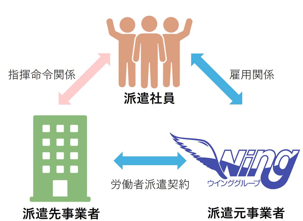 ウイング(派遣元)と「雇用関係」を結んだスタッフを、企業様(派遣先)に派遣します。